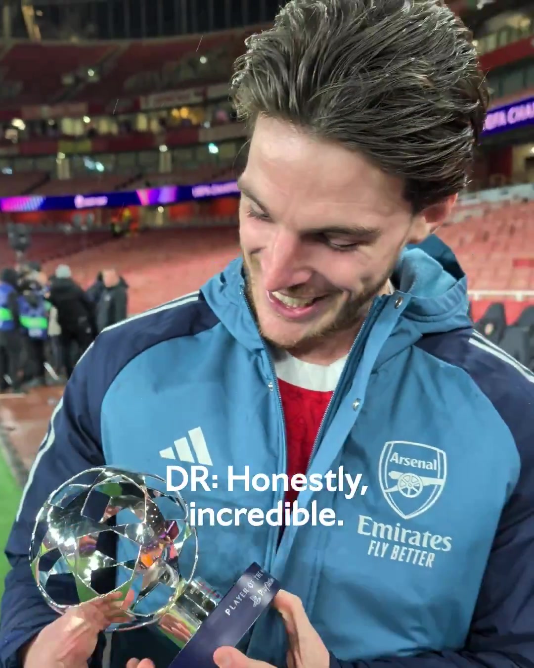 赖斯领取全场最佳奖杯:主场击败拜仁+再次当选最佳,我太开心了